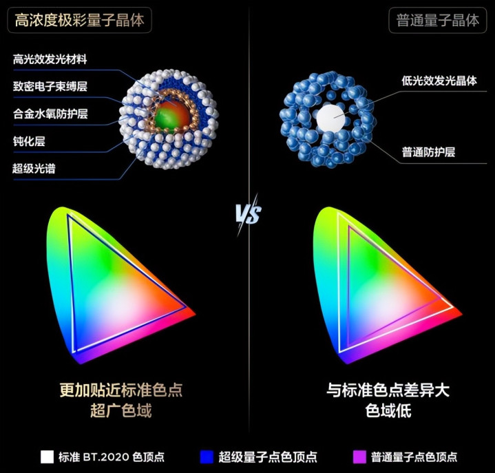 它采用使用的是高浓度极彩量子晶体,能发出超级光谱——红、绿、蓝三原色光更纯净,混合后形成色彩纯度极高的白光背光。这种方式从源头上就减少了串色的可能性,因为光源本身是混合后的白光,而非物理上分离的三色光。